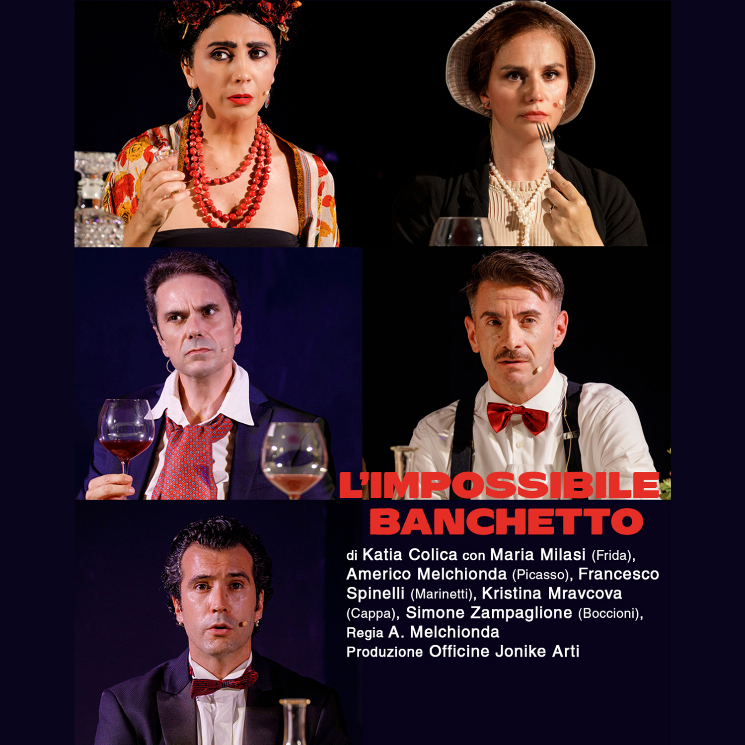 Lo Spettacolo L’Impossibile Banchetto sceglie di sedurre lo spettatore attraverso un’ironia visionaria, orchestrando un incontro impossibile tra grandi voci dell’arte del Novecento. Il cuore invisibile della scena è Salvador Dalì, assente ma onnipresente, convocato da ogni parola, evocato da ogni dettaglio. La sua assenza è la drammaturgia stessa: è vuoto e regia, mancanza e onnipotenza. Il banchetto è per lui, ma è anche il suo autoritratto in negativo: non c’è, ma tutto gli somiglia. Il testo si sviluppa come una tessitura dialogica e simbolica: il linguaggio alterna l’asprezza della rivalità alla delicatezza della memoria, la leggerezza del paradosso all’intimità dell’autoritratto emotivo. Ogni personaggio non è solo una “figura storica”, ma una maschera drammaturgica che porta in scena le fratture, le ambizioni, le visioni di un’epoca. Frida Kahlo è la chiave del banchetto. La linea di rottura tra autobiografia e creazione, tra corpo e pittura. La sua voce – potente, viva, dolorosa – porta il tema del trauma nell’architettura del banchetto, trasformando la scena in un campo magnetico di intensità e contraddizione. Non solo per la forza emotiva e visiva che la sua figura incarna, ma perché è lei a comprendere prima di tutti il significato profondo dell’arte nel tempo e nello spazio: prigione e orizzonte aperto. Frida sa – e lo dice – che l’arte rende immortali, ma lo fa al prezzo di una condanna: l’artista resta imprigionato nel ruolo, nel mito, in una forma che lo trascende e lo supera. In lei convivono ferita e visione, corpo e metafisica. È l’unica a vedere oltre l’apparenza conviviale del banchetto, rivelando ciò che gli altri non sanno ancora. Pablo Picasso, nel cuore del dispositivo scenico, si offre come misura del reale e dell’irreale, del coraggio e della consuetudine. La sua presenza è ambigua e centrale: da un lato è testimone del caos, dall’altro custode di una forma; capace di smontare e ricostruire, è il personaggio che tiene insieme l’istinto dirompente e la necessità di struttura. Magnetico e controverso, diventa ago della bilancia fra delirio e controllo, fra rivoluzione e permanenza. Benedetta Cappa, si confronta con la propria posizione di donna, artista e compagna. Non è l’ombra di Marinetti, ma la sua interlocutrice più profonda e lucida. La sua presenza scompone e ricompone il Futurismo da una prospettiva finalmente differente: quella del margine che si fa centro. Boccioni e Marinetti si affrontano e si rincorrono in un gioco di specchi tra ideologie, estetiche e passioni. La scena ne restituisce le pulsioni: l’arroganza, la febbre, la lucidità, ma anche la fragilità. Marinetti è verbo e gesto, Boccioni è fuoco e slancio. Insieme, generano tensioni e attriti che diventano struttura ritmica del testo. L’opera gioca su un doppio registro: è visivamente onirica, ma interiormente concreta. Dietro la tavola apparecchiata si cela una riflessione tagliente sull’arte come spazio di attrito, di possesso e di perdita. L’immaginario daliniano, evocato nelle scenografie e nelle luci, non è solo cornice ma vera e propria drammaturgia visiva, che accompagna e moltiplica i livelli di lettura. L’Impossibile Banchetto è un meccanismo scenico che interroga la Storia dell’arte come se fosse un sogno fatto a pezzi: ci chiede non tanto di capire, quanto di restare. È una sfida teatrale che, attraverso il surreale, cerca una verità più intima e più feroce: quella delle relazioni, della creazione, della memoria che non muore mai davvero.